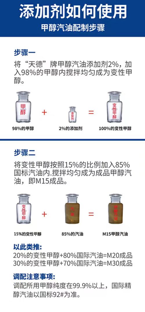 天德牌甲醇汽油添加劑配制的變性甲醇,可任意比例與國標汽油混溶,也可以與乙醇汽油混溶,還可以與石腦油互溶配制92號汽油。
